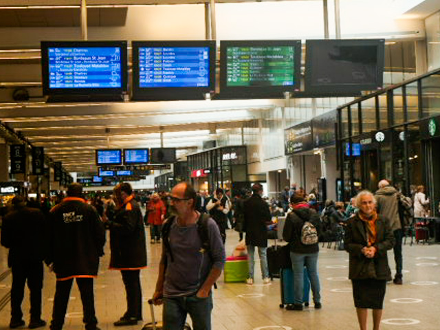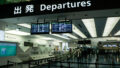 エスカレーターで2階へ上がる、電光掲示板が並ぶ通路にたくさんの人。